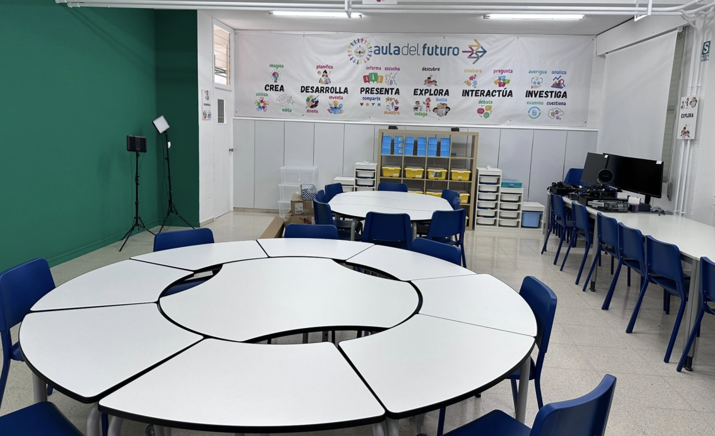 La gran apuesta fue transformar la biblioteca, el aula más amplia y visible del centro, en el Aula del Futuro. El préstamo bibliotecario se trasladó al Aula EDIT. El nuevo espacio fomenta la lectura activa (cuentacuentos, teatro, talleres creativos). El ayuntamiento colaboró con electricidad, iluminación y tomas, mientras el AMPA apoyó la iniciativa y se reutilizó mobiliario.