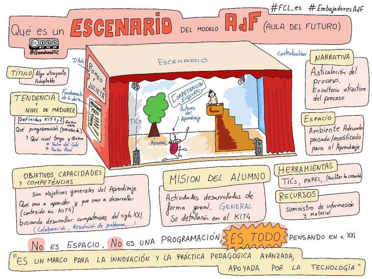 Finalmente, se trabajó la creación de escenarios con la ayuda de Francisco Jesús Gómez, Embajador de Ceuta. Se aclaró el concepto de escenario y se debatió sobre él con el objetivo de no confundirlo con otros conceptos. Para ayudar en esta tarea, Guillermo Medrano, Embajador de La Rioja, compartió una ilustración realizada por él donde se muestra qué debería ser un escenario del modelo Aula Del Futuro y qué implica este escenario.
